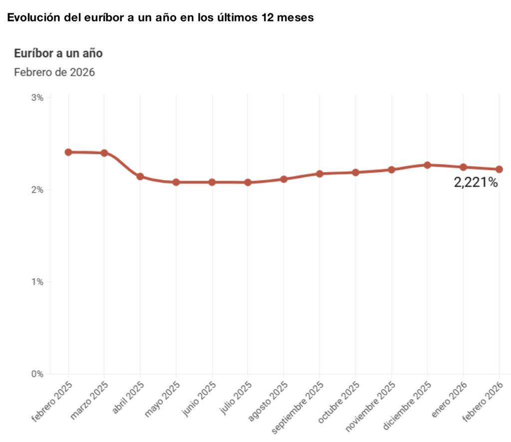 El índice euríbor a un año, que es utilizado como principal referencia para fijar el tipo de interés de los préstamos hipotecarios concedidos por las entidades de crédito españolas, se situó en febrero en el 2,221 % frente al 2,245 % del mes anterior. Tomando como referencia los últimos 12 meses, el índice registra un descenso de 0,186 puntos, según informa el Banco de España.