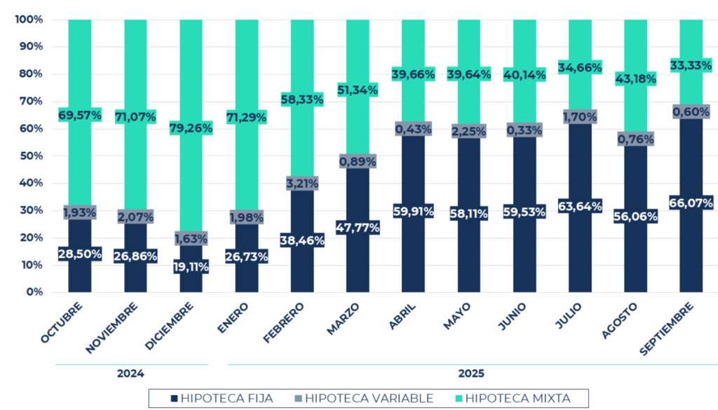 Concretamente, en julio, este tipo de préstamos representó el 63,64 % de las hipotecas firmadas, en agosto el 56,06 %, y en septiembre alcanzó el 66,07 %, el porcentaje más alto desde noviembre de 2022. Esta evolución refleja la búsqueda de estabilidad por parte de las familias ante un entorno financiero que, aunque moderado, sigue marcado por la incertidumbre respecto a la evolución del euríbor y las decisiones del BCE. En contraste, las hipotecas mixtas, que lideraron el mercado entre enero de 2023 y abril de 2025, se mantienen ahora en segunda posición, aunque perdiendo algo de protagonismo al pasar de estar presentes en el 34,66 % de firmas de julio al 33,33 % en septiembre. Por su parte, las variables continúan en mínimos y solo representan el 1 % de las firmas totales del trimestre.