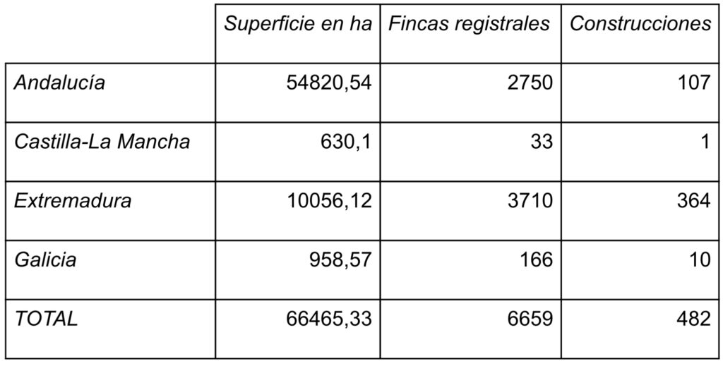 Según informa Registradores de España, los datos de superficie y fincas registrales actuales afectadas para cada Comunidad Autónoma serían los siguientes: