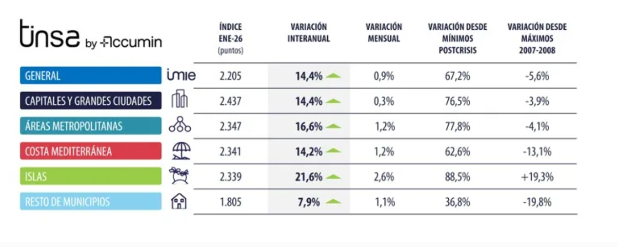 “En enero se han vuelto a registrar intensas tasas de crecimiento de los precios residenciales en todas las zonas, especialmente en torno a los polos de empleo y focos turísticos, en donde la brecha entre demanda y oferta de vivienda es más acentuada. Continúa así la tendencia iniciada en 2025 hacia una mayor dificultad de acceso para el hogar medio en los principales polos de actividad y una ampliación de las áreas de influencia de las ciudades”, destaca Cristina Arias, directora del Servicio de Estudios de Tinsa by Accumin.