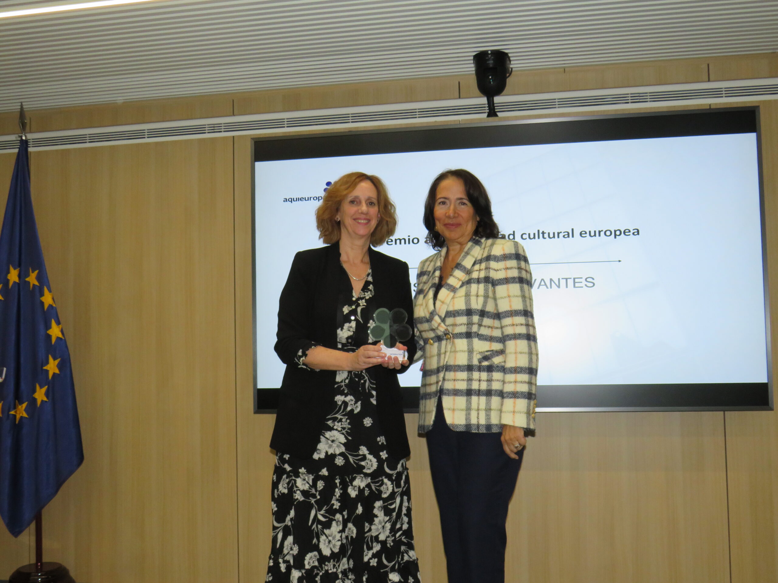 El Premio a la actividad cultural europea fue otorgado al Instituto Cervantes, en reconocimiento a su papel en la promoción de la lengua española y la cultura hispánica como parte del patrimonio común europeo. Asela Pintado, presidenta de Prensamedia, fue la encargada de entregar este galardón, que fue recibido por Carmen Noguero, Secretaria General del Instituto Cervantes.