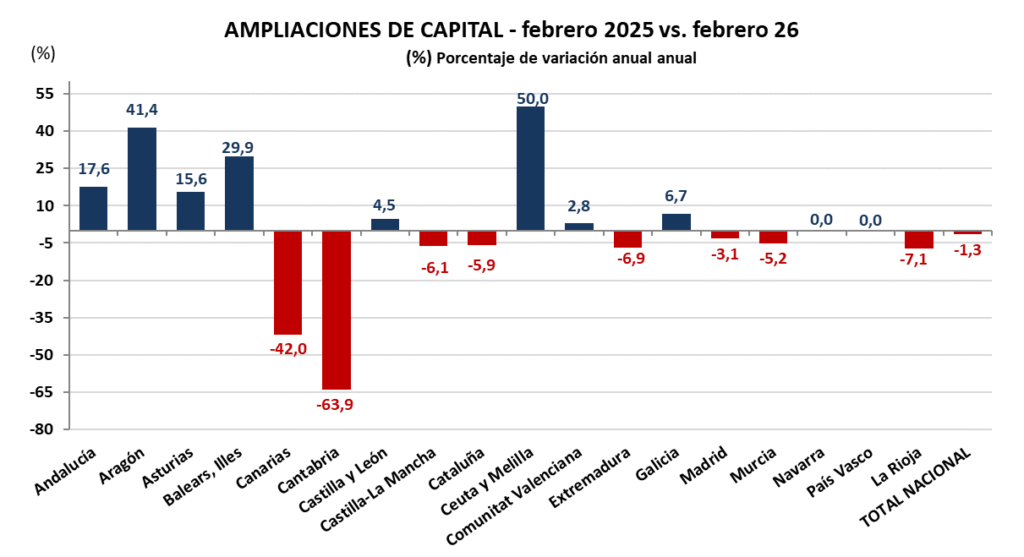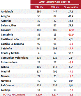 En el análisis por regiones, Madrid vuelve a encabezar la lista en número de operaciones, con 792 ampliaciones registradas en febrero, lo que supone un descenso del 3,1% frente al mismo periodo del año anterior. Le sigue de cerca Cataluña con 698 ampliaciones, un 5,9 % menos. En el conjunto del territorio, Ceuta y Melilla y Aragón presentan los mayores incrementos, en contraste con Cantabria y Canarias que muestran los descensos más acusados.