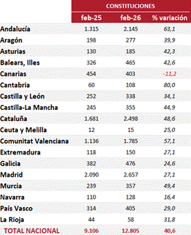 Por Comunidades Autónomas, solo en Canarias descienden las constituciones, mientras que Cantabria, Andalucía y la Comunitat Valenciana encabezan los incrementos. Como es habitual, Madrid, Cataluña, Andalucía y la Comunitat Valenciana concentran conjuntamente más del 70% de las nuevas empresas constituidas en España.