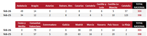 Durante el mes de febrero se han inscrito 304 concursos de acreedores en los Registros Mercantiles, lo que representa un descenso del 23,6 % frente al mismo mes de 2025, cuando se registraron 398 concursos. Las Comunidades de Cataluña, Comunitat Valenciana y Madrid, en conjunto, agrupan casi seis de cada diez concursos registrados en febrero.