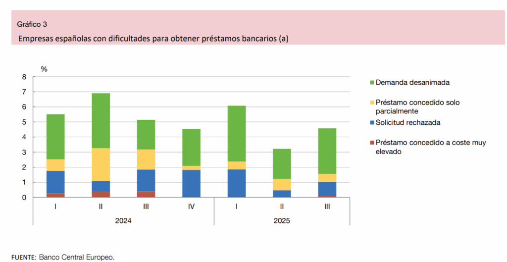 Este último factor es también la principal razón que explica el crecimiento en el indicador de obstáculos4 para obtener préstamos bancarios, que aumentó un punto y medio en el tercer trimestre de 2025, hasta situarse en un 4,6 %, nivel que no obstante puede seguirse considerando reducido.