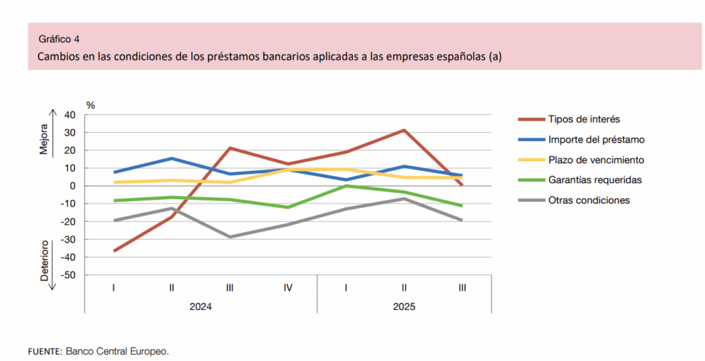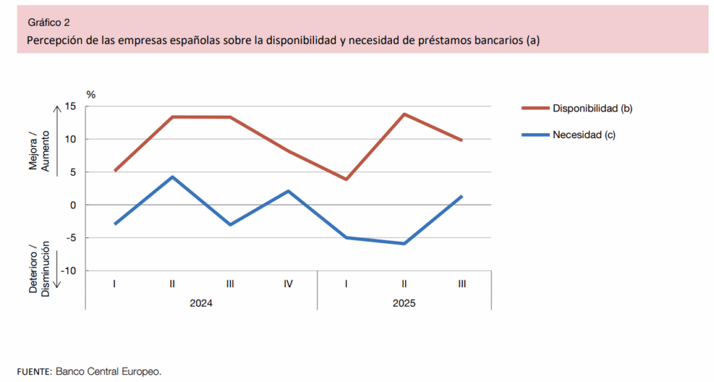 Finalmente, en cuanto a las expectativas, un 11 % de las empresas, en términos netos, anticipaban que continuaría mejorando su acceso a la financiación bancaria en el cuarto trimestre de 2025.