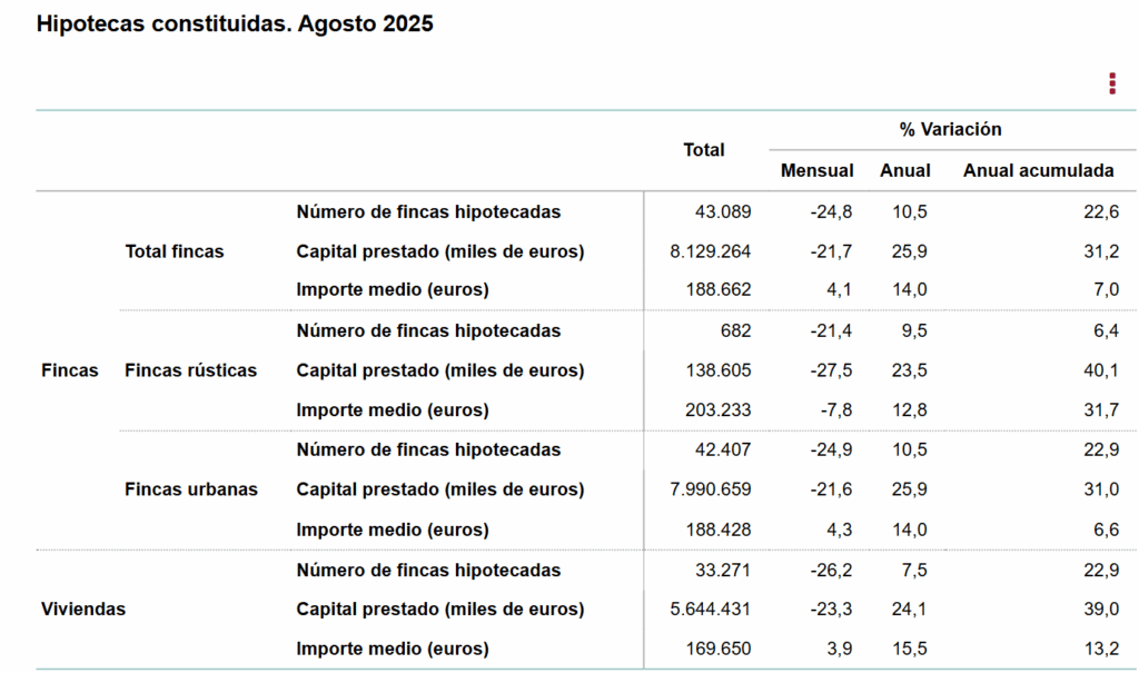 El número de hipotecas constituidas sobre viviendas fue de 33.271, un 7,5 % más que en agosto de 2024. El importe medio de estas operaciones fue de 169.650 euros, con un aumento del 15,5 %.