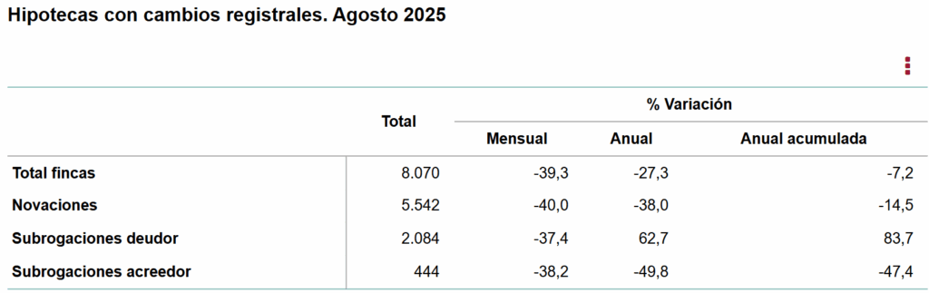 Las novaciones (o modificaciones con la misma entidad financiera) disminuyeron un 38,0 % y las subrogaciones al acreedor (cambia de entidad) un 49,8 %.