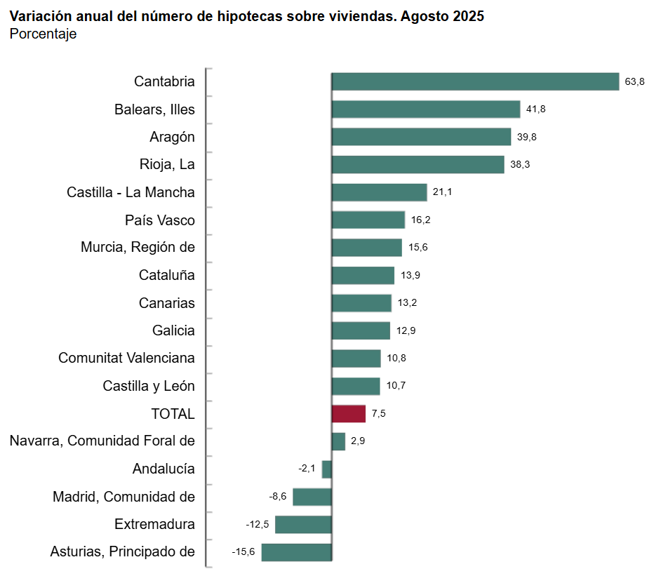 Las comunidades con las mayores tasas de variación anual en el número de hipotecas sobre viviendas en agosto fueron Cantabria (63,8 %), Illes Balears (41,8 %) y Aragón (39,8 %).
